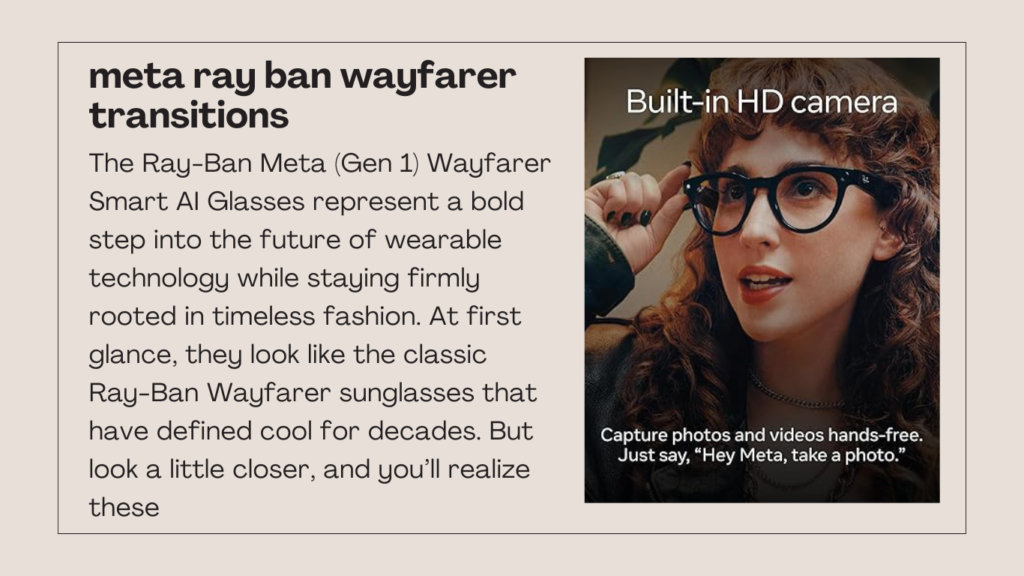 The Ray-Ban Meta (Gen 1) Wayfarer Smart AI Glasses represent a bold step into the future of wearable technology while staying firmly rooted in timeless fashion. At first glance, they look like the classic Ray-Ban Wayfarer sunglasses that have defined cool for decades. But look a little closer, and you’ll realize these glasses are doing far more than protecting your eyes or completing your outfit. Designed for both men and women